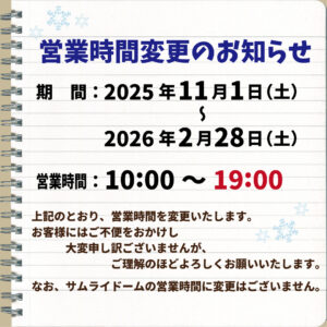 冬期営業時間変更のお知らせ 誠に勝手ながら下記のとおり、営業時間を変更いたします。 ◆期間:2025年11月1日(土)~2026年2月28日(土) ◆営業時間:10:00~19:00 ※定休日:水曜日 冬期だけ通常より1時間早く閉店の短縮営業となります。 ご来店の際にはご注意ください。 お客様にはご不便をおかけし大変申し訳ございませんが、ご理解のほどよろしくお願いいたします。 なお、サムライドームの営業時間に変更はございません。
